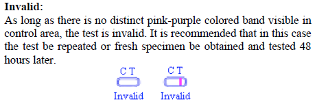 1. As long as there is no distinct pink-purple colored band visible in the control area, the test is invalid as shown in Figure 3. It is recommended that in this case, the test be repeated or a fresh specimen be obtained and tested 48 hours later.